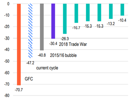 Mit Ausnahme des Crashs während der globalen Finanzkrise erleben wir derzeit den stärksten Rückgang seit über zwanzig Jahren. Die Verluste übertreffen das Platzen der großen Spekulationsblase in den Jahren 2015/16 (-40,8 %), und die Erschütterungen durch den Handelskrieg von Trump im Jahr 2018 (-30,4 %).