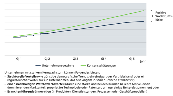Erkennbares Wachstumspotenzial, das aber noch nicht vollständig in den Kursen eingepreist ist, kann Anlegern überdurchschnittliche Renditen bescheren. Diejenigen, die einen längerfristigen Horizont haben und das Ertragspotenzial der Unternehmen nicht nur in den nächsten zwölf Monaten, sondern in den nächsten drei bis fünf Jahren analysieren, können erhebliche „Wachstumslücken" zwischen den Konsensschätzungen und dem viel längerfristigen Wachstumspotenzial der Unternehmen identifizieren. Wie Abbildung 2 zeigt, können die strukturellen und nachhaltigen Wettbewerbsvorteile eines Unternehmens sowie seine Innovationskraft langfristige Gewinne liefern, die die Konsenserwartungen deutlich übertreffen.