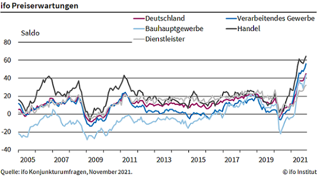 München, 26. November 2021 - Derzeit wollen so viel Firmen in Deutschland ihre Preise erhöhen wie nie zuvor. Der Index der ifo-Preiserwartungen ist auf 45 Punkte gestiegen, einen neuen Rekordwert seit dem Beginn der Umfragen. Im Vormonat lag der Wert bei 41 Punkten. Das ifo Institut fragt dabei Firmen nach Plänen für Preiserhöhungen in den kommenden drei Monaten.