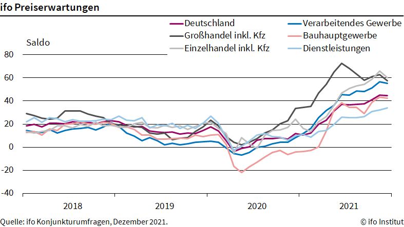 Die sehr hohen Umfragewerte ziehen sich durch alle Wirtschaftszweige. Im Einzelhandel liegen die Preiserwartungen bei 60 Saldenpunkten, gefolgt vom Großhandel mit 57 und der Industrie mit 55. Im Baugewerbe wurde ein Wert von 42 erreicht. Der geringste Wert mit 34 Saldenpunkten wurde bei den Dienstleistern gemessen. Dennoch stellt das für diesen Wirtschaftszweig einen neuen Rekordwert dar.