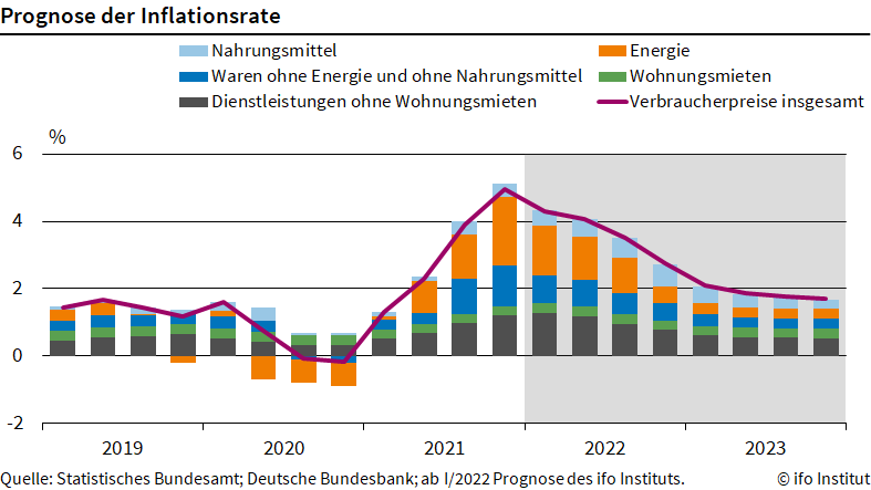 "Das wird bis auf die Verbraucherpreise durchschlagen", sagt Timo Wollmershäuser, Leiter der ifo Konjunkturprognosen. "Die Inflation wird im Verlauf dieses Jahres nur langsam zurückgehen. In den kommenden Monaten werden die monatlichen Raten noch über 4 Prozent liegen und sich erst gegen Ende 2022 allmählich der 2-Prozent-Marke nähern. Für das Gesamtjahr rechnen wir nun mit einer Inflationsrate von etwa 3½ Prozent."