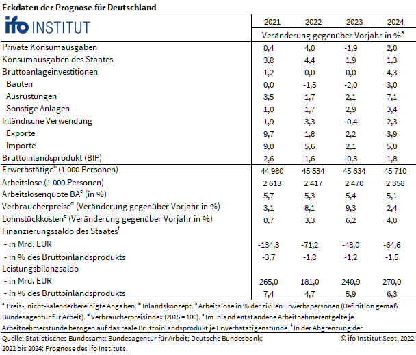 Im Vergleich zum Juni senkt das ifo seine Wachstumsprognose für 2023 deutlich um 4,0 Prozentpunkte und erhöht die Inflationsprognose kräftig um 6,0 Prozentpunkte. „Das sind ungewöhnlich hohe Änderungen in einem so kurzen Zeitraum“, sagt Wollmershäuser weiter. Die Energieversorger passten vor allem zu Jahresbeginn 2023 ihre Strom- und Gaspreise spürbar an die hohen Beschaffungskosten an. Das werde die Inflationsrate im ersten Vierteljahr sogar auf etwa 11 Prozent hochtreiben. Damit gingen die realen Haushaltseinkommen kräftig zurück und die Kaufkraft sinke spürbar. Das dritte Entlastungspaket der Regierung dürfte diesem Rückgang zwar etwas entgegenwirken, ihn aber bei weitem nicht ausgleichen.