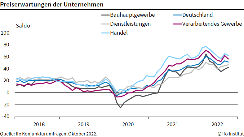 München, 28. Oktober 2022 – Etwas weniger Unternehmen als im Vormonat planen demnächst, ihre Preise zu erhöhen. Das geht aus der aktuellen Umfrage des ifo Instituts hervor. Die ifo Preiserwartungen für die kommenden Monate sanken für die Gesamtwirtschaft im Oktober auf 51,5 Punkte, nach 53,8* im September. Vor allem der Handel und das Verarbeitende Gewerbe planen weniger Anhebungen, während die Preiserwartungen bei den Dienstleistern und im Baugewerbe steigen. „Die Inflationswelle ist noch nicht gebrochen“, sagt ifo-Konjunkturchef Timo Wollmershäuser. „Vor allem die hohen Energiekosten sind noch nicht vollständig auf die Verbraucher überwälzt.“