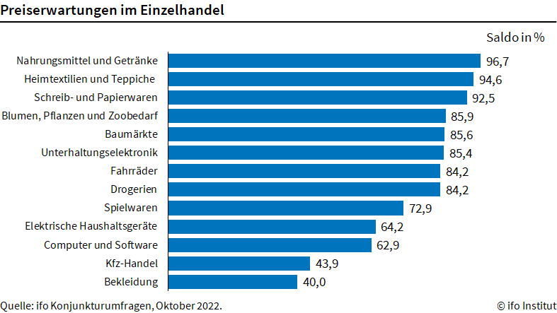 Lebensmitteleinzelhändler planen weiterhin kräftige Preiserhöhungen. Dort lagen die Preiserwartungen bei 96,7 Punkten, nach 100,0 im Vormonat. Auch die Verkäufer von Heimtextilien und Teppichen (94,6), von Papier- und Schreibwaren (92,5), die Bau- und Heimwerkermärkte (85,6) und die Verkäufer von Unterhaltungselektronik (85,4) wollen mehrheitlich ihre Preise anheben. Lediglich beim Handel mit Gebrauchtwagen sind erstmals seit März 2021 leicht sinkende Preise zu erwarten. Dort gingen die Preiserwartungen zurück auf minus 5,8 von plus 25,7 im Vormonat.