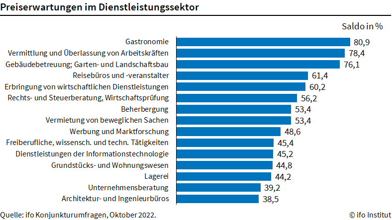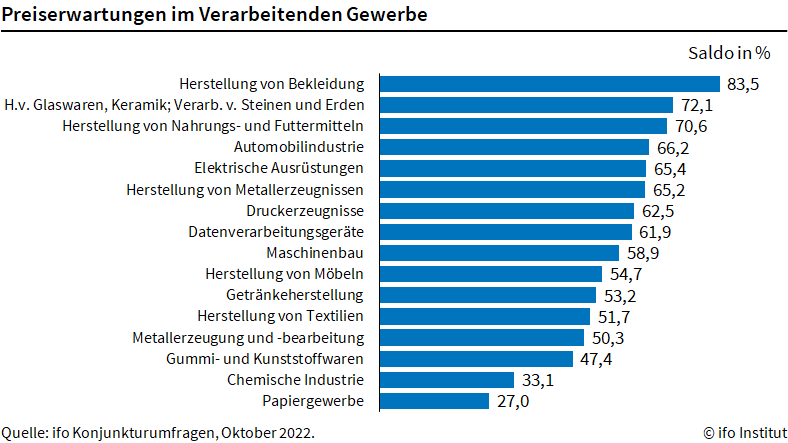 Die Unternehmen im Verarbeitenden Gewerbe wollen mehrheitlich ihre Preise anheben. Allerdings ist ihr Anteil im Vergleich zum Vormonat zurückgegangen. In der Chemie sanken die Preiserwartungen von 52,3 auf 33,1 Punkte, in der Papierbranche von 65,3 auf 27,0 Punkte. Besonders hoch sind die Preiserwartungen bei den Herstellern von Bekleidung (83,5), Glaswaren und Keramik (72,1) sowie Nahrungs- und Futtermitteln (70,6). Auch die Dienstleister wollen ihre Preise mehrheitlich anheben. Die Preiserwartungen sind auf 47,0 Punkte gestiegen, von zuvor 45,5. Sehr hoch sind die Preiserwartungen in der Gastronomie (80,9).