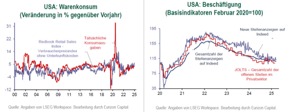 Insgesamt lässt sich sagen, dass keiner dieser Indikatoren auf eine Erholung der Inflation oder unerwartete Auswirkungen der Zölle hindeutet. Allerdings ist anzumerken, dass in den USA das Anhalten der Inflation über dem Niveau vor der Pandemie durch eine begrenzte Anzahl von Komponenten erklärt wird, wobei jedoch weiterhin ein starker Preisdruck besteht.